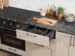 Кухни из МДФ зачастую отделывают шпоном, ламинатом, пластиком, пленкой. У нас в магазине модели отделаны качественной синтетической плёнкой. Она не выцветает, хорошо переносит сырость и средства для мойки, привлекательна и популярна.