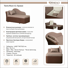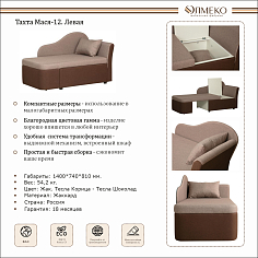 Удобная и практичная тахта. Взяли такую в детскую. Изготовлена хорошо. Материал обивки качественный и приятный на ощупь, пятна отчищаются хорошо, без единого следа. Что по самой тахте, то она раскладывается на полноценное спальное место. Хороший поролон, не проседает.