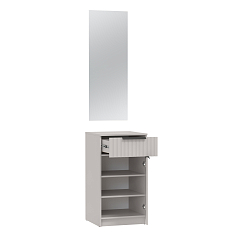 Понравился дизайн, хорошо украшает прихожую. В ней можно поместить несколько пар обуви и другие необходимые вещи. Все дверки легко открываются. Удобно обуваться сидя