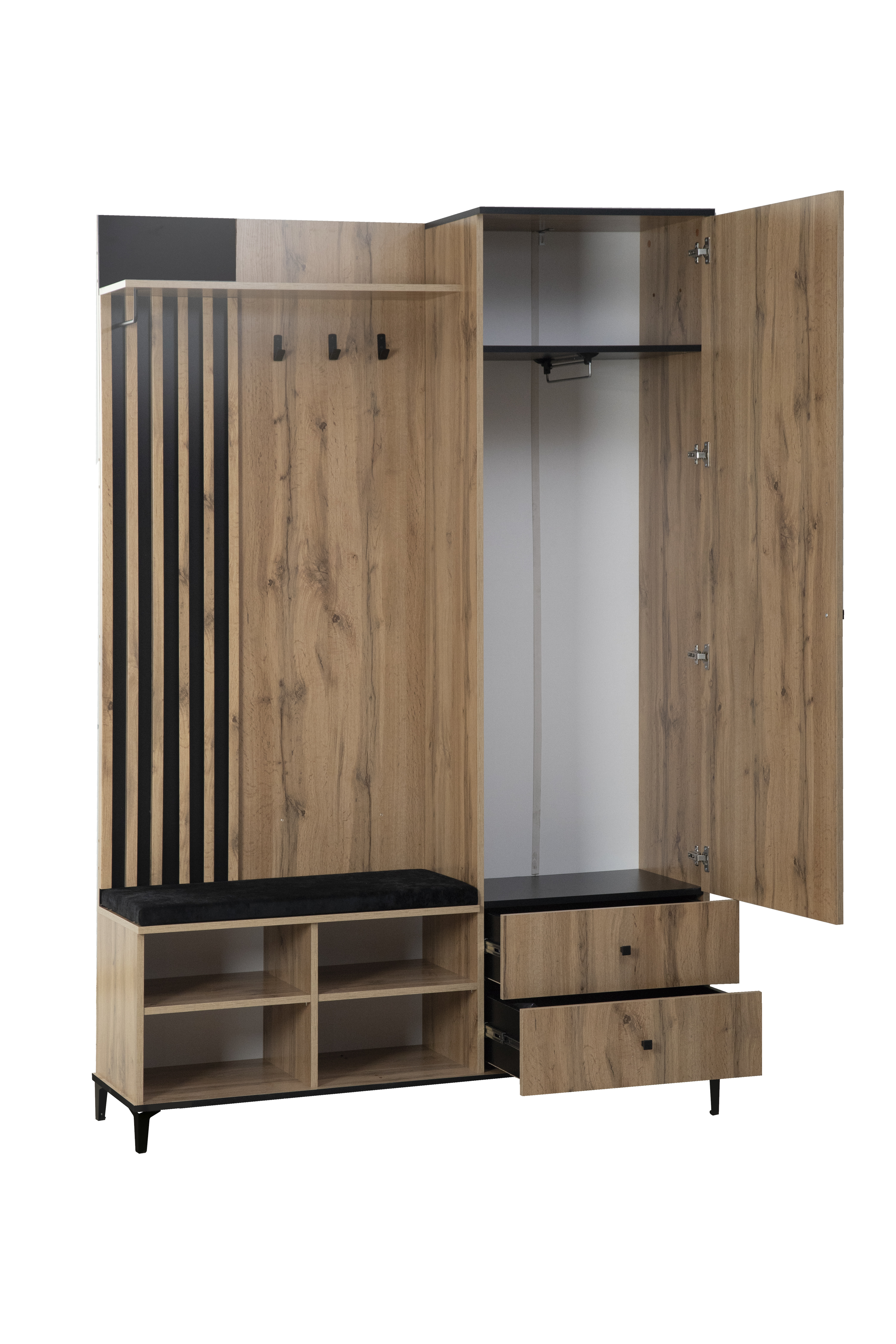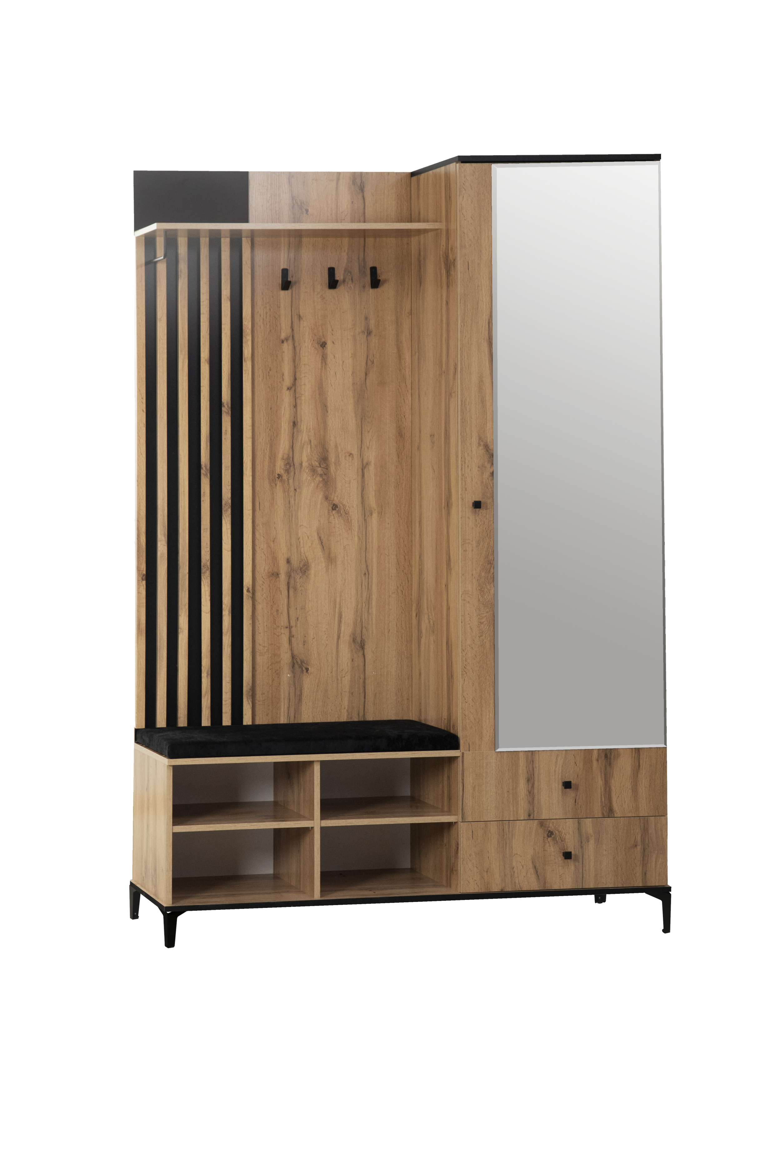Шкаф для прихожей 51.22 Либерти (h=150) (с зеркалом) # (дуб вотан / черный / ткань: велюр Dombai 04 черный / профиль: Masa Decor дуб вотан / ДВПО: белый) от российской фабрики Олмеко отлично подойдет для многих квартир. Многолетний опыт в производстве позволил создать стильную, комфортную и доступную мебель с долгим сроком службы. Товар доступен в Нижнем Новгороде. Закажите у нас и получите быструю доставку в любую точку города. При покупке предоставляется гарантия производителя.
