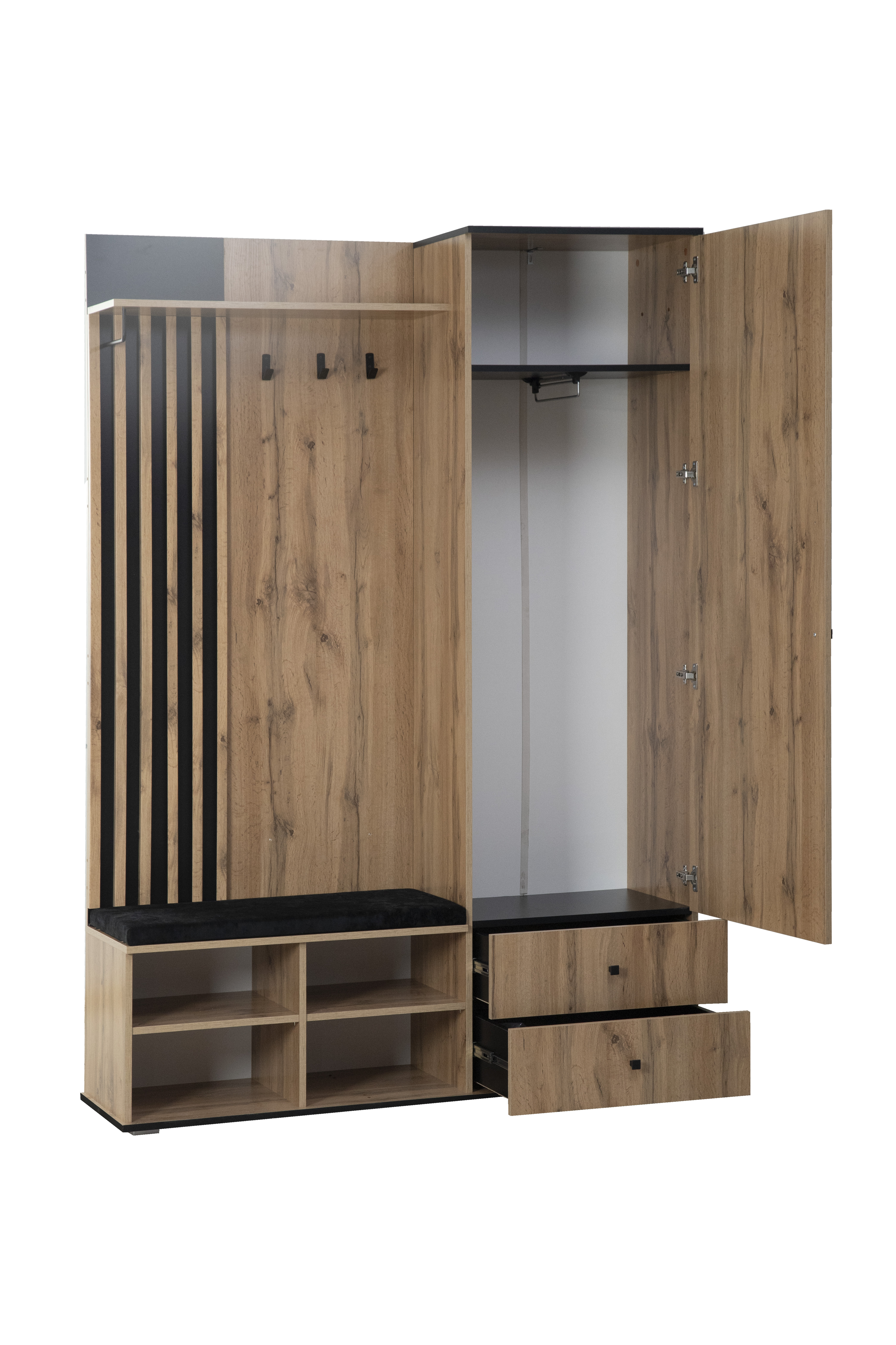 Шкаф для прихожей 51.22 Либерти (h=20) (с зеркалом) # (дуб вотан / черный / ткань: велюр Dombai 04 черный / профиль: Masa Decor дуб вотан / ДВПО: белый) от известного производителя отлично подойдет для многих квартир. Большой опыт в производстве позволил создать красивую, удобную и недорогую мебель которая прослужит вам долго. Мы продаем мебель в Нижнем Новгороде с гарантией производителя. Закажите у нас и получите быструю доставку в любую точку города.