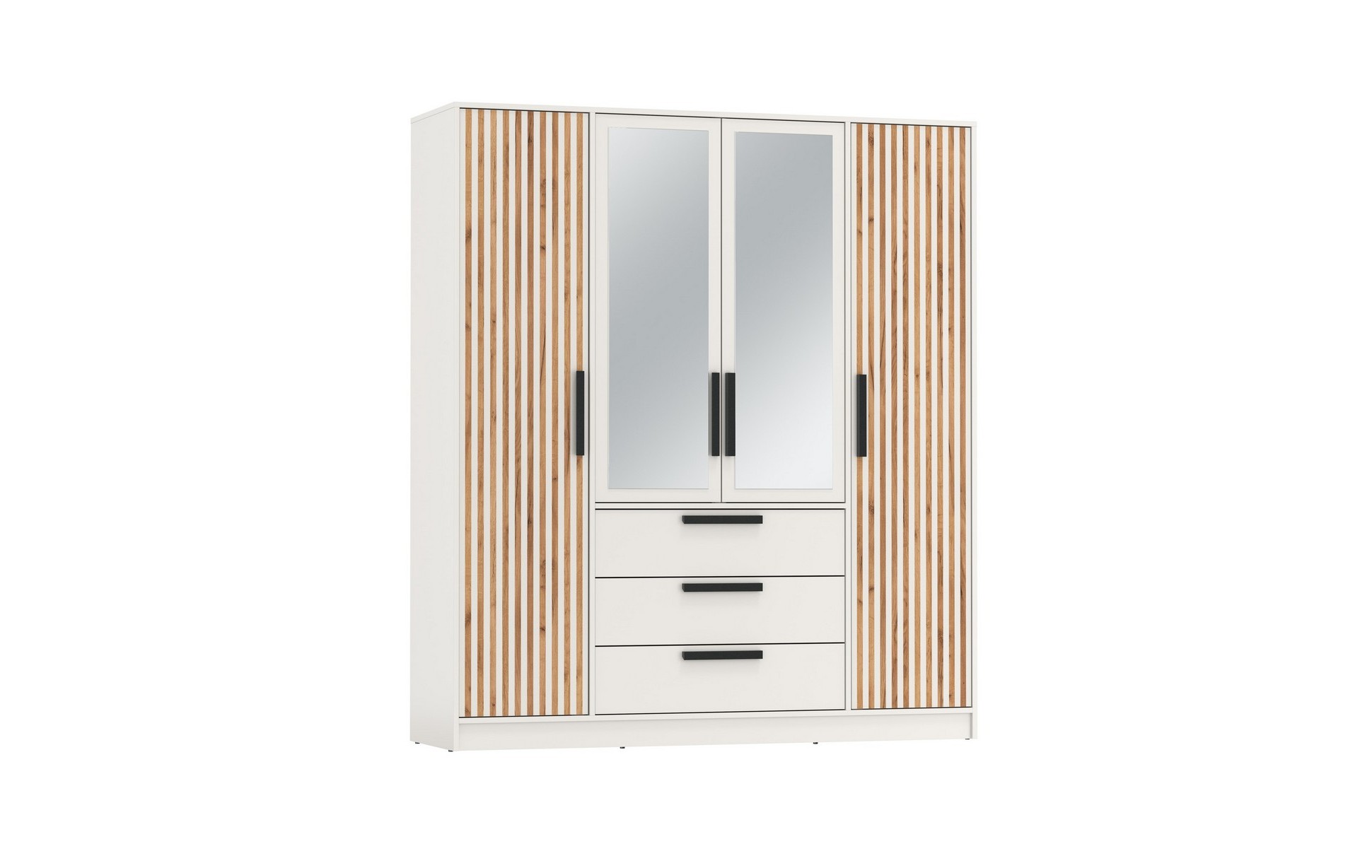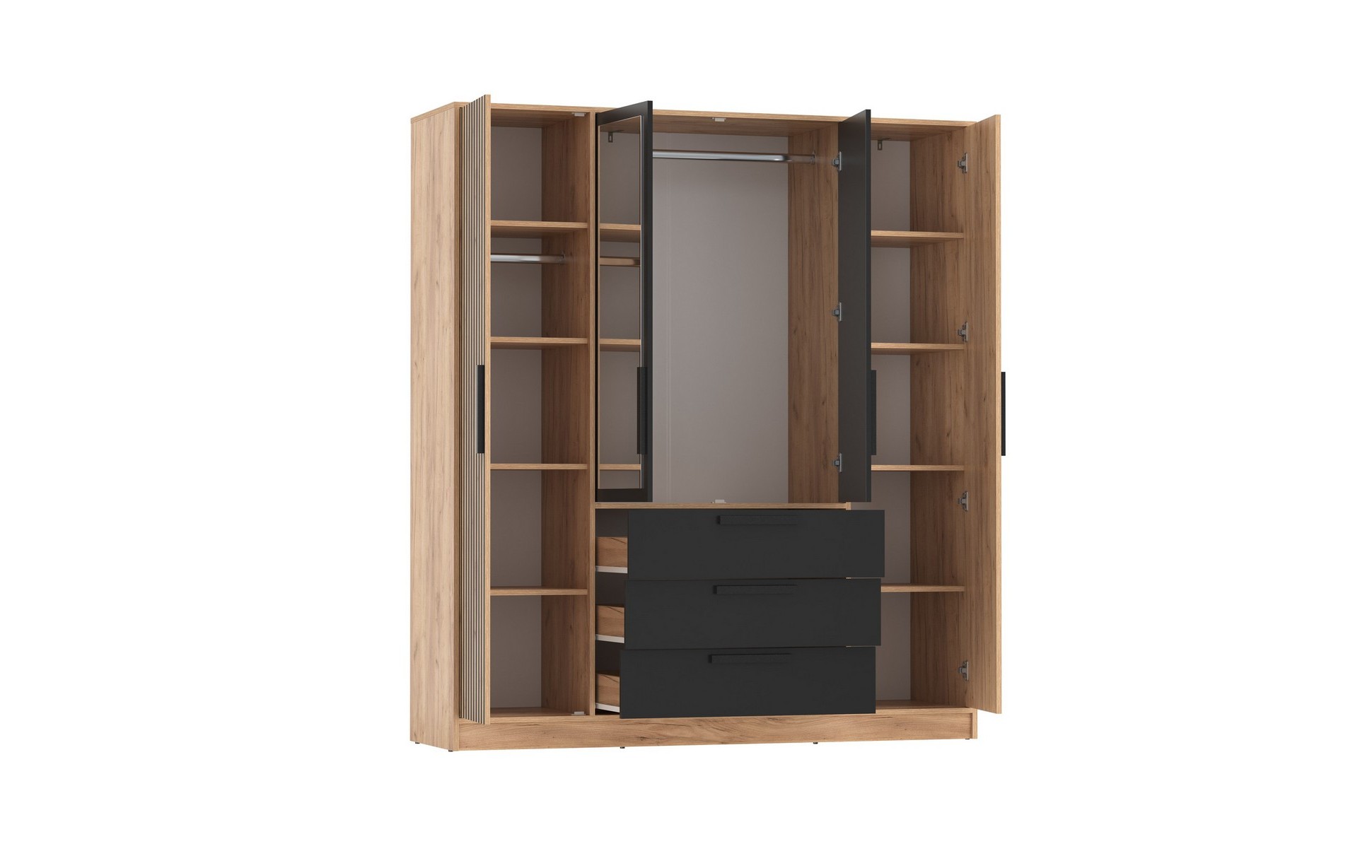 Спальня Вегас Шкаф для одежды 83.07 Вегас (4-х дв.) с зеркалом и тумба 83.10 (дуб золотой / черный / ДВПО: белый) от известного производителя отлично подойдет для многих квартир. Большой опыт в производстве позволил создать красивую, удобную и недорогую мебель которая прослужит вам долго. Мы продаем мебель в Нижнем Новгороде с гарантией производителя. Закажите у нас и получите быструю доставку в любую точку города.